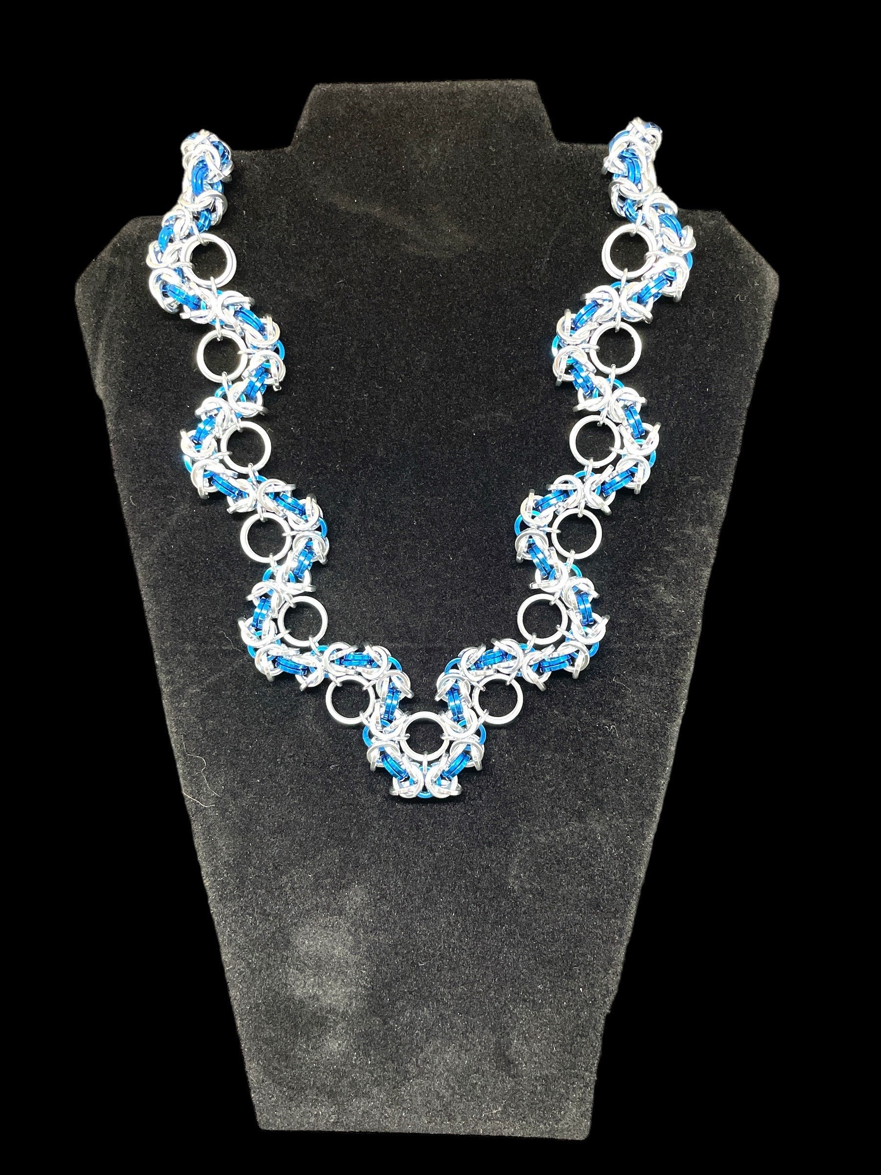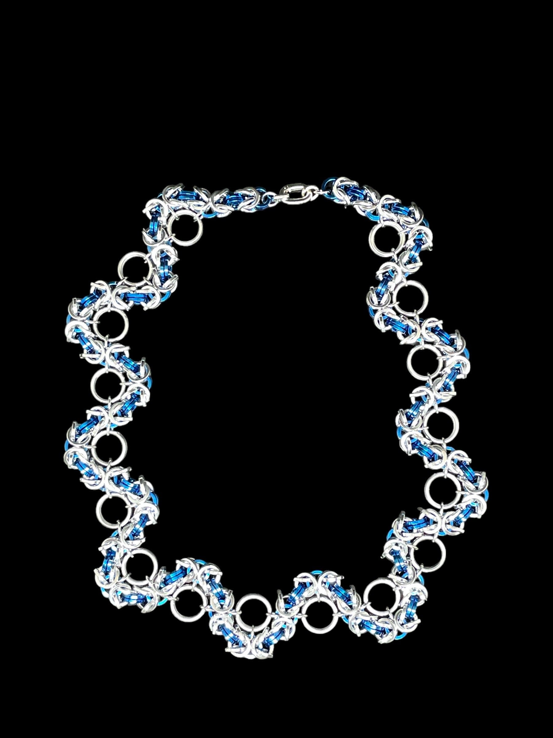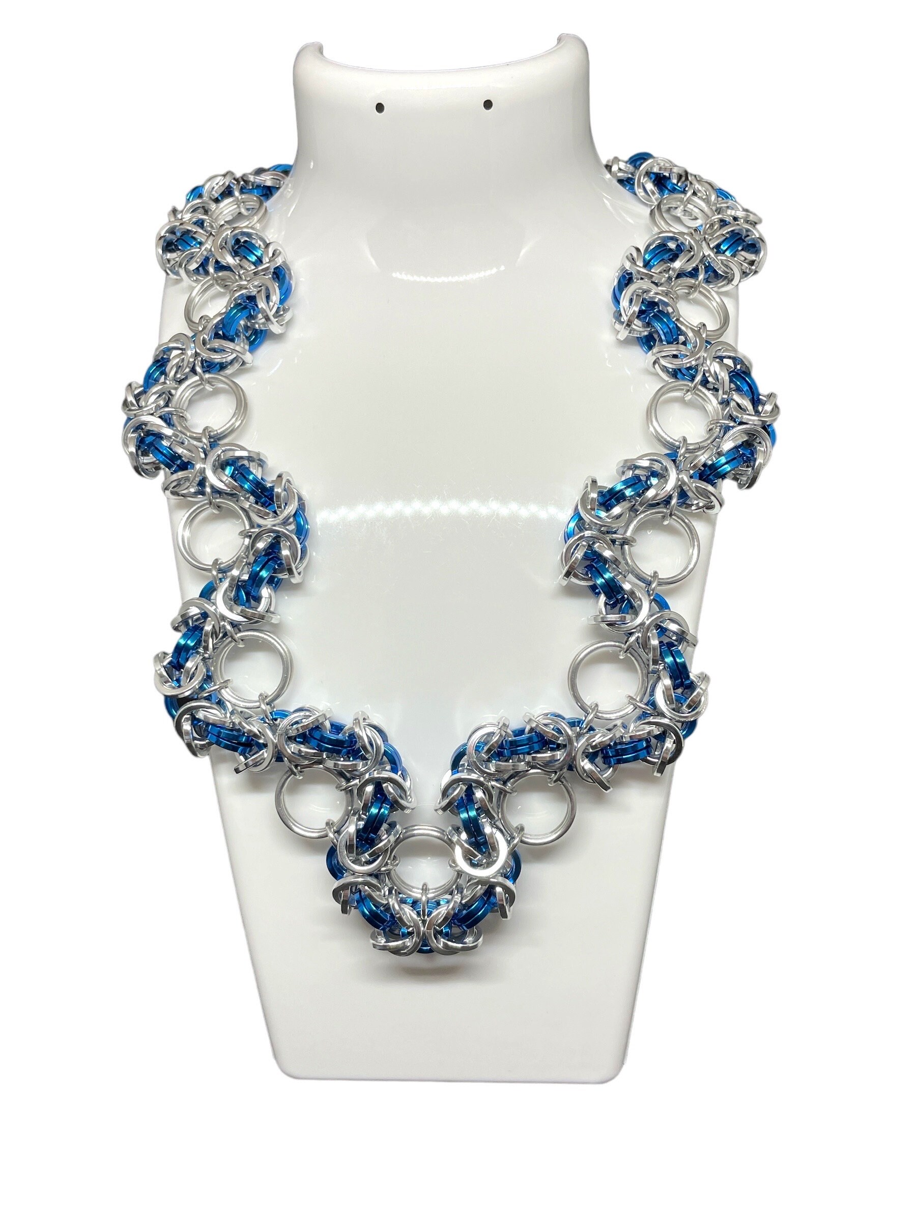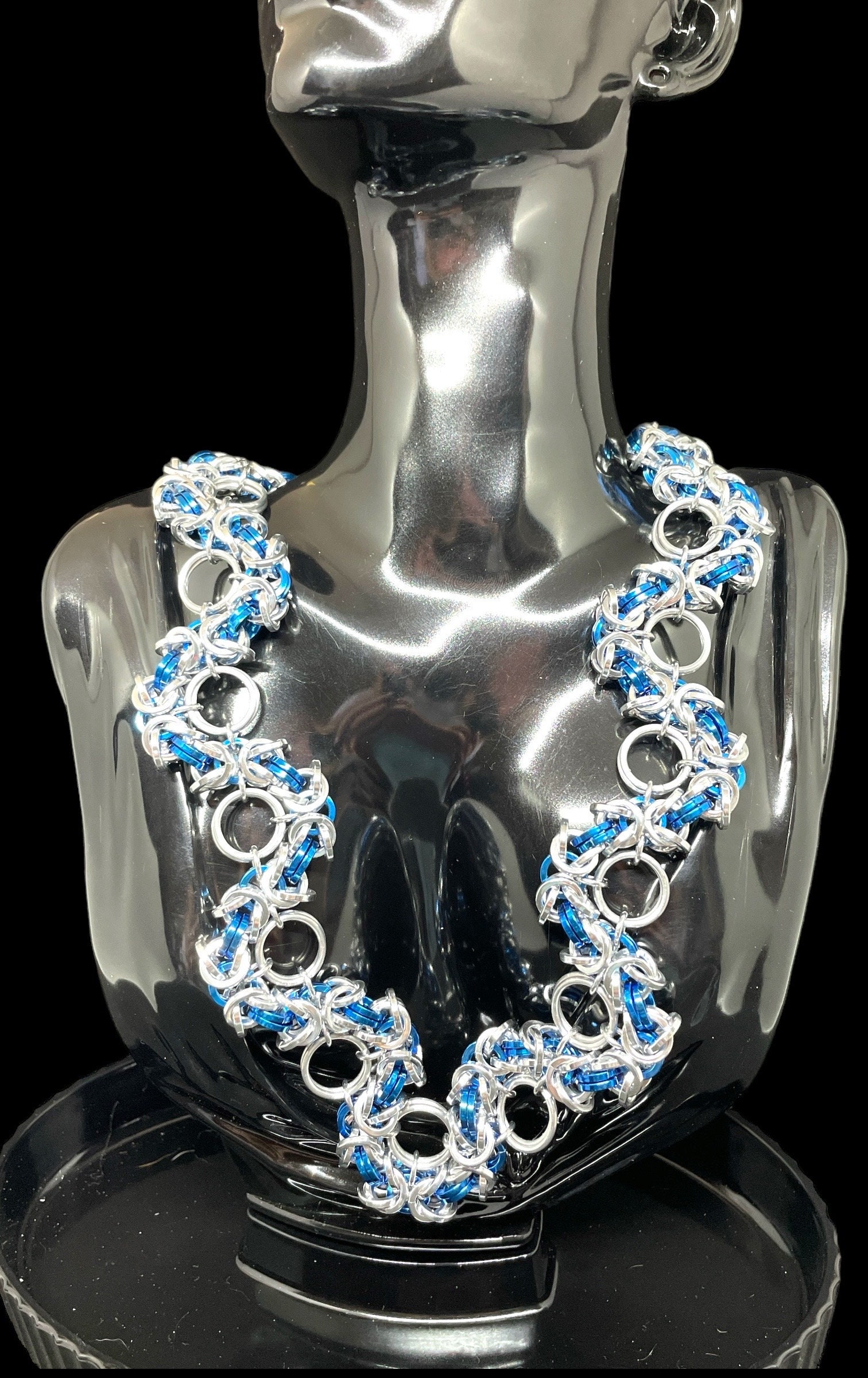 Unleash your inner enchantress with our stunning Slithery Snake Necklace! This hand-woven masterpiece combines shimmering silver and vibrant blue square anodized aluminum rings, creating a mesmerizing, lightweight piece you can wear with ease. The anodized colors remain vivid and untarnished, ensuring lasting brilliance. Measuring 19.5" in length, 1" in width, and 1/4" in depth, it wraps around your neck with a secure D-ring clasp. Elevate your style with this unique statement necklace that promises to captivate and enchant.
